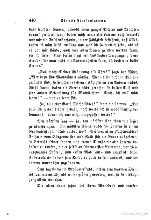 Die Laterne stand übrigens gescheuert und sauber in einem Winkel, wo sie jederzeit in die Augen fiel; die Leuten sagten zwar, daß es nur ein altes Gerümpel sei, aber daran kehrten sich die Alten nicht, sie liebten die Laterne.